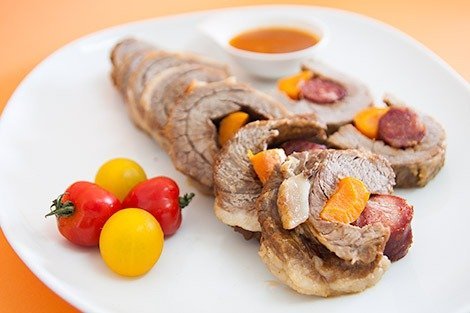 - Cubra com 1 fatia de presunto gordo ou com toucinho entremeado. Enfeite com 2 folhas de louro e 3 bagas de zimbro.