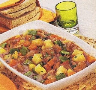 - Emumapanela,coloque oóleo,acebolaeoalho; friteaté acebola murchar.Junteacarne,misture bemerefogueem fogo baixo até a carne ficar cozida. Junte o tomate, os pimentões, a abobrinha e tempere com sal e pimenta. Misturedelicadamente ecozinhe emfogobaixo, mexendo algumasvezesdurante ocozimento.Quando oslegumes estiveremcozidos,retiredofogo epolvilhecom asalsinha eacebolinha.