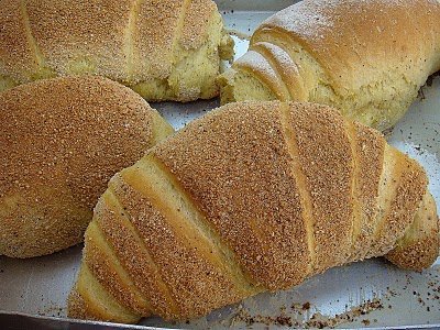 - Misture e deixe por 10 minutos em lugar abafado. Depois, acrescente 3 gemas, 1 colher de sobremesa de sal, 100 g de manteiga derretida já fria e ½ xícara de chá de água fria. Mexa e coloque farinha de trigo(cerca de 6½ xícaras de café ou copos pequenos de extrato). Trabalhe a massa e, em seguida, cubra com um pano e guarde em armário fechado por 20 minutos. Modele os pães e deixe descansar durante 1 hora. Asse, retire do forno, cubra com um pano por 5 minutos, pincele com manteiga e coloque queijo parmesão ralado. O pão não deve corar.