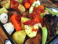 - Descasque e corte os legumes e tubérculos em pedaços de 5 cm. Retire a assadeira do forno e adicione os legumes e os tubérculos, misture bem e acrescente os tomates cortados em pedaços. Leve ao forno sem cobri e asse por mais uma hora. Salpique com sal e pimenta-do-reino e regue com um fio de azeite de oliva. Sirva.