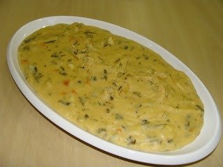 - Numa panela grande, em fogo médio. frite a cebola e o alho no azeite até começar a dourar. Junte o mandioca, o coentro e a pimenta. Refogue por cerca de 1 minuto, mexendo bem. Acrescente o caldo de galinha, misture e aumente o fogo. Quando ferver, abaixe o fogo e cozinhe mexendo de vez em quando, até o líquido evaporar e formar um creme. Verifique o tempero e acrescente o sal, se necessário. Sirva a seguir. Obs: Esta receita dá aproximadamente 16 porções.