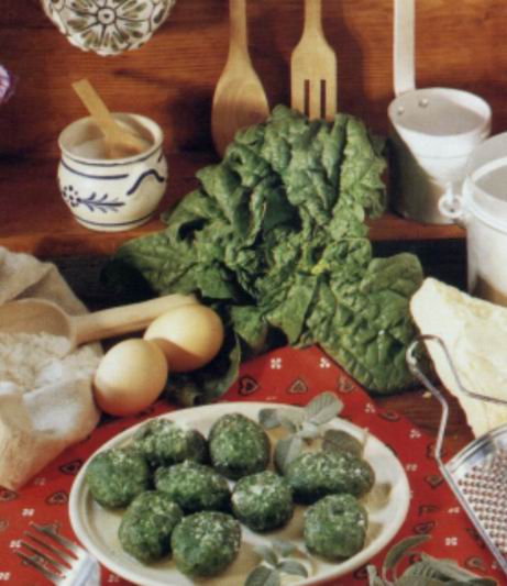 - Ponha o pão em um recipiente, umedeça-o com o leite, feche o recipiente e deixe repousar por 8 horas. Cozinhe as folhas de verduras em água. Depois coe e esprema-as bem. Quando estiverem frias, coloque-as no recipiente do pão, com os ovos e sal e misture tudo muito bem. Agora triture esta mistura e prepare a massa até obter uma bola não muito macia (caso necessário, adicione farinha de rosca). Divida a massa em pedacinhos e faça filetes com um centímetro de diâmetro que serão cortados em pequenos "nhoquis". Jogue os "nhoquis" (um a um) em uma caçarola com água