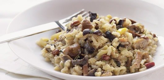 - Dissolva o cubo de caldo de galinha na água a ferver e junte-lhe o vinho branco. Vá adicionando o caldo ao arroz, a pouco e pouco, à medida que este o vai absorvendo, e mexendo sempre. Quando tiver juntado cerca de ⅔ do caldo, adicione os cogumelos salteados e misture bem.