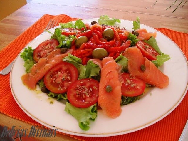 - Num prato GRANDE, colocar a alface, ao centro colocar o pimento, de lado as fatias de salmão fumado enroladas, em volta do prato as rodelas de tomate, e regar com o molho para salada.