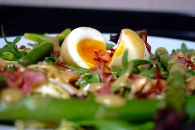 - Raspe os fios dos espargos e coza-os em água temperada com sal. Escorra e corte em bocados. Pele, retire as grainhas e corte o tomate em bocadinhos. Pique o cebolinho e misture tudo. Separe as gemas das claras dos ovos cozidos. Esmague as gemas, misture com a maionese, o iogurte natural, as natas, o vinagre e a mostarda. Tempere com sal, pimenta, sumo de limão e açúcar. Misture com os espargos e o tomate. Sirva a salada em pratos individuais, sobre folhas de alface e polvilhada com a clara de ovo picada e salsa.