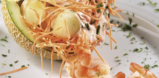 - Distribua a salada pelas meias meloas e decore com as gambas.