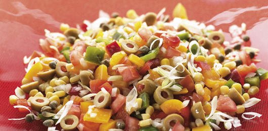 - Limpe os pimentos de grainhas e corte-os em pedaços. Descasque e pique a cebola e corte o alho francês (só a parte branca) ou o cebolo em rodelas fininhas. Lave num passador, debaixo de água corrente. Misture os pimentos com a cebola e o alho francês numa saladeira, junte o milho escorrido, os tomates, limpos de grainhas e cortado a gosto, uma colherada dealcaparras e um punhado de azeitonas.