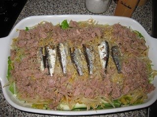- Corte o salmão fumado às tiras e coloque por cima da salada, formando uma grade.