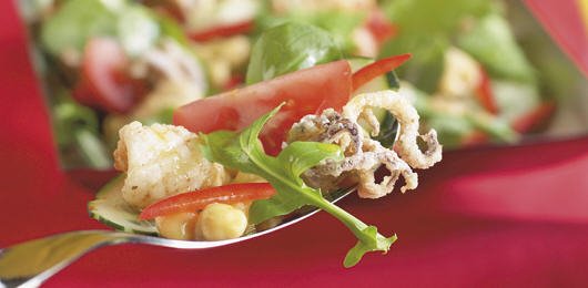 - Espalhe a salada sobre uma cama de folhas de rúcula e por cima coloque as lulas.