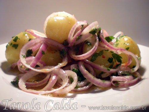 - Descasque as batatas e corte-as em fatias grossas. Coza-as em água fervente com sal, ate se apresentarem macias. Escorra bem. Deixe arrefecer. Corte o presunto em tiras finas. Coloque numa taça as batatas, as azeitonas, os pimentos, o manjericão e o presunto. Junte delicadamente com a vinagreta.