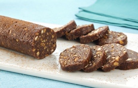 - Passe manteiga no papel alumínio, coloque a mistura e enrole dando o formato de salame. Leve ao congelador por 30 minutos. Corte em fatias finas sem retirar o papel.