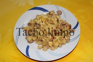 - De seguida escorre-se bem o atum e corta-se as salsichas as rodelas finas e junta-se tudo ao refogado sempre mexendo bem para não pegar ao tacho,depois junta-mos as batatas fritas em cubos finos ou em palitos (como preferir) e mexemos bem.