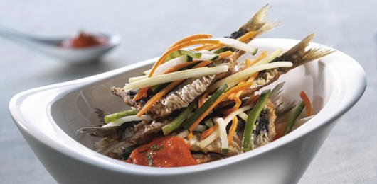 - Aqueça óleo Vaqueiro numa frigideira e frite os filetes de sardinha, previamente passados por farinha e bem sacudidos, de ambos os lados , começando pelo lado da pele. Escorra sobre papel absorvente.