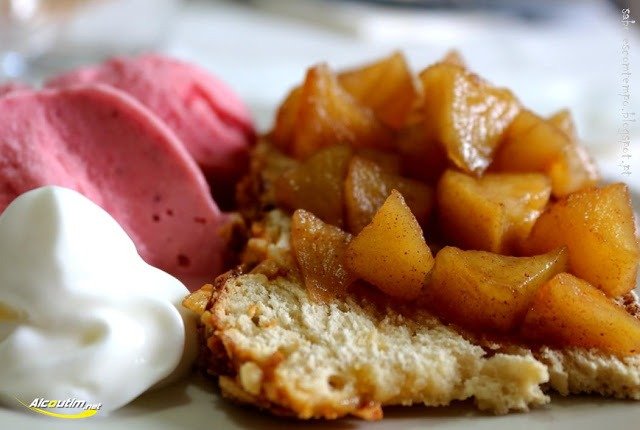 - Descasque, tire os caroços e corte as maçãs em pedacinhos. Deite num tacho e polvilhe com 2 colheres de sopa de açúcar. Tape o tacho e leve a cozer sobre lume brando cerca de 10 minutos até as maçãs estarem tenrinhas mas não desfeitas.