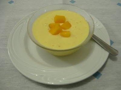 - Escorra a manga e leve a calda a ferver no lume ou no micro ondas. Espalhe os pedaços de manga sobre uma tarteira de vidro ou de louça.