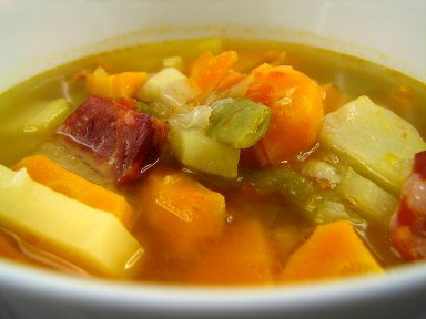 - *300 gr. de cenoura *500 gr. de batatas para cozer *1 cebola *1 dente de alho *20 gr. de manteiga ou margarina *7,5 dl. de caldo de legumes (instantâneo) *4 dl. de sumo de laranja *1 colher de sopa de natas frescas *Sal e pimenta *Pimenta de caiena *8 cogumelos grandes *Salsa picada