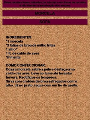 - Coza a morcela, retire a pele e desfaça-a no caldo das aves. Leve ao lume até levantar fervura. Rectifique os temperos. Sirva com crotões de broa esfregados com o alho. Já no prato, regue com um fio de azeite.