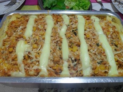 - Deite metade do preparado na forma e espalhe por cima os bolinhos esmagados com o licor.