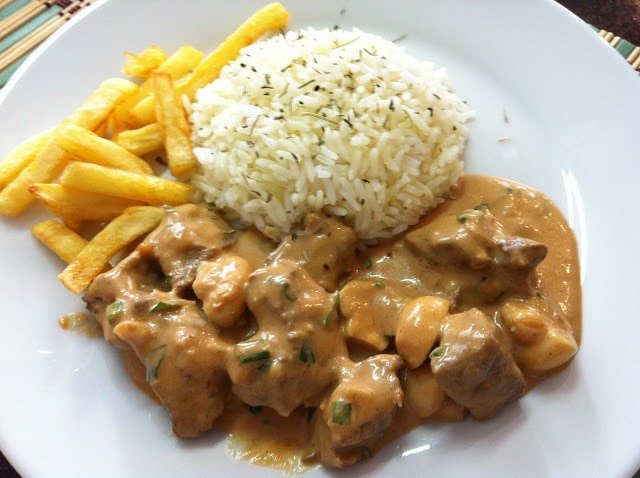 - Adicione a carne o tomate batido, a manteiga, a cebola, o catchup, a farinha, o champignon e o vinho.