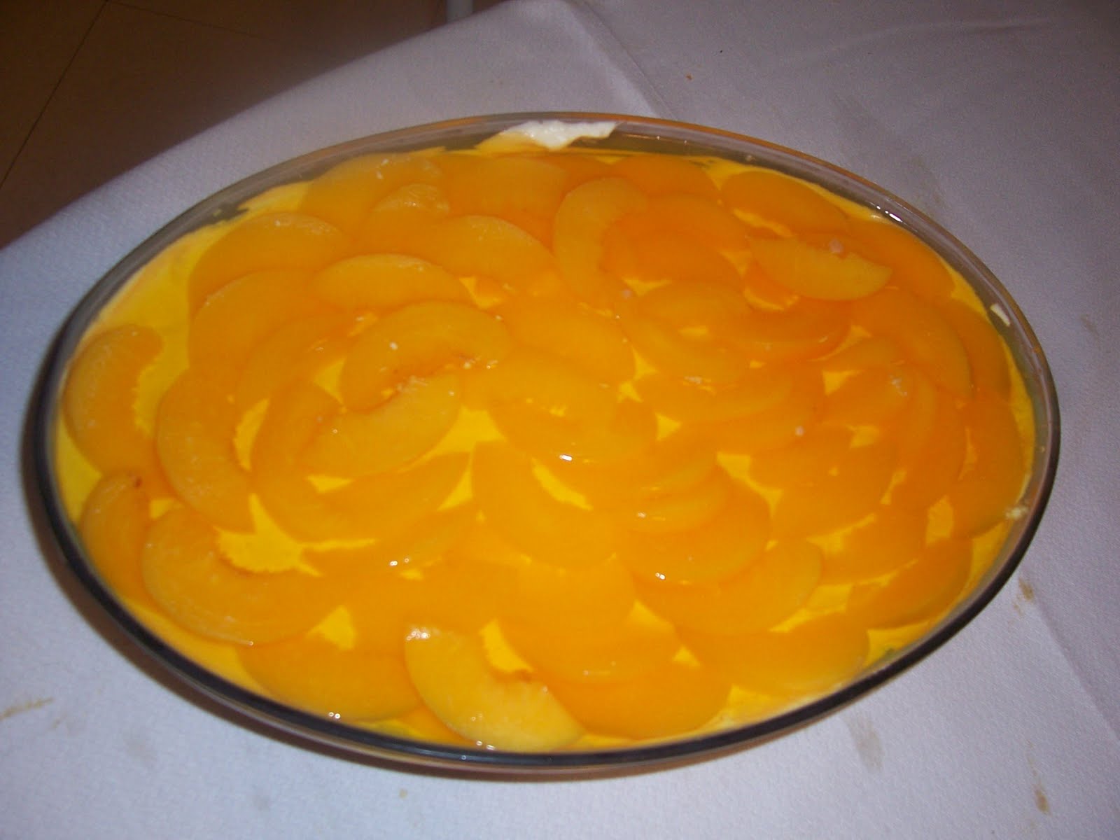 - Antes de servir, retire o anel da forma e decore com os pêssegos em calda, previamente escorridos e cortados em fatias.