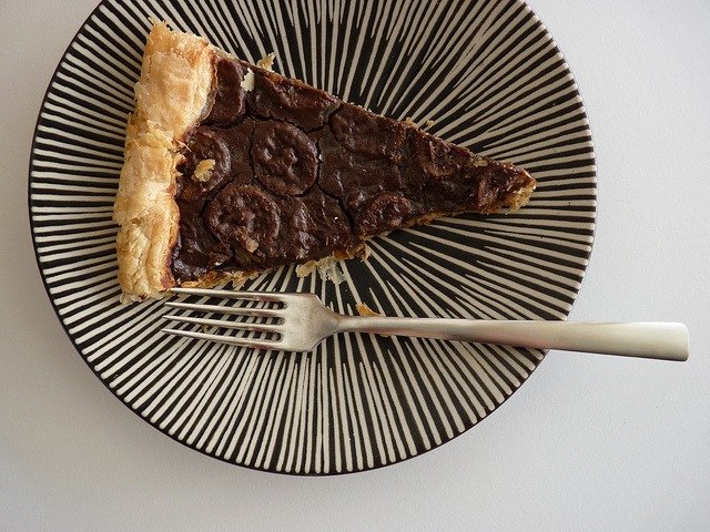 - Entretanto, desenrole uma das placas de massa, mantendo-a sobre o papel. Sobre ela disponha as bananas cortadas como quiser. Regue com o chocolate derretido e cubra com a outra placa de massa. Pique a massa com a ponta de uma faca afiada e leve ao forno durante 15 a 20 minutos.