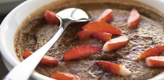 - Sirva as tartitas de chocolate, ainda mornas, salpicadas com os morangos.