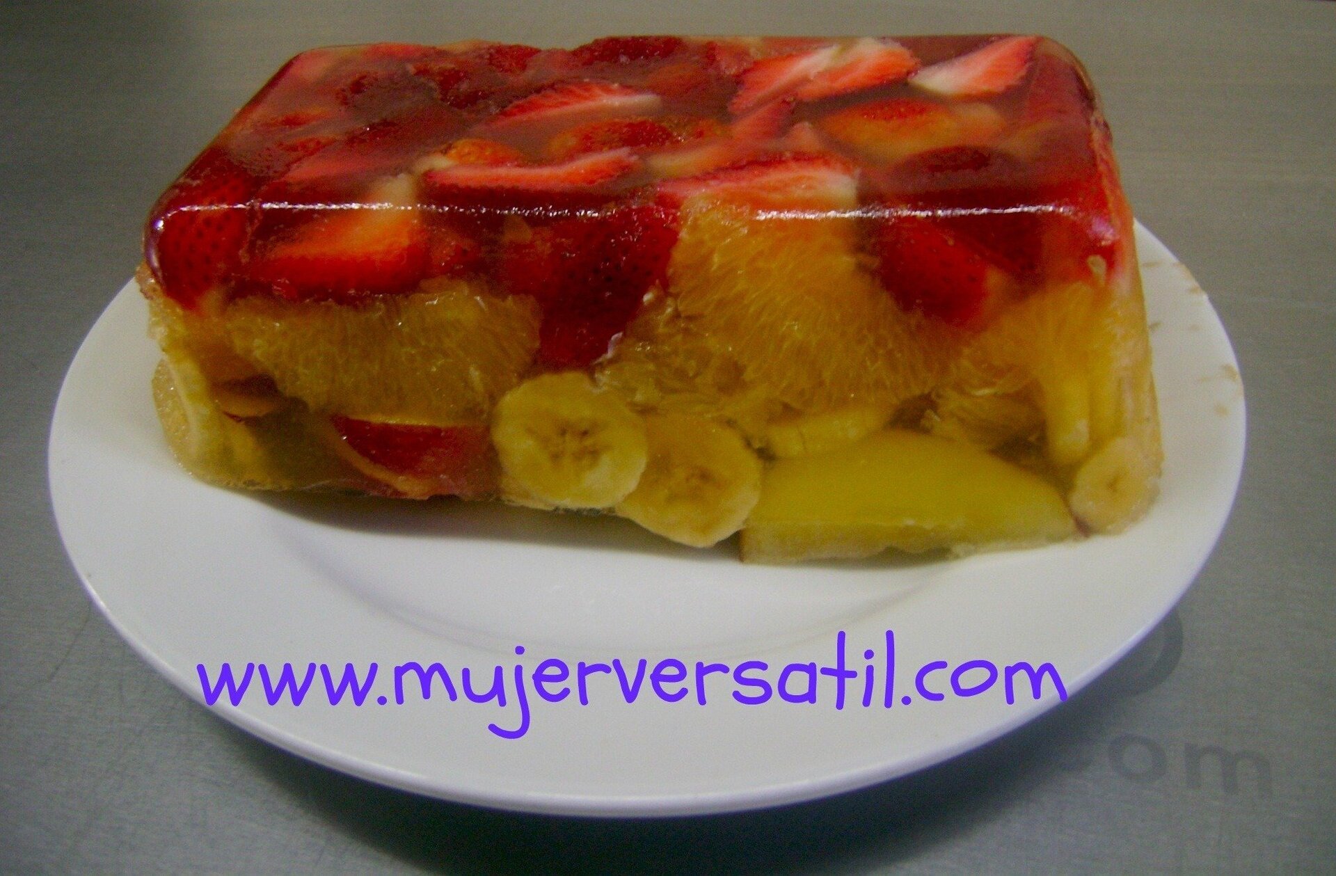 - Enquanto despeja, dê pequenas pancadas no fundo, para que a gelatina se ajuste em volta das peças de fruta.