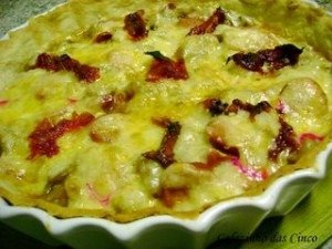 - Depois colocar o recheio no pirex e por cima colocar 200 g de queijo prato ralado e levar para gratinar no forno por uns 15 minutos.