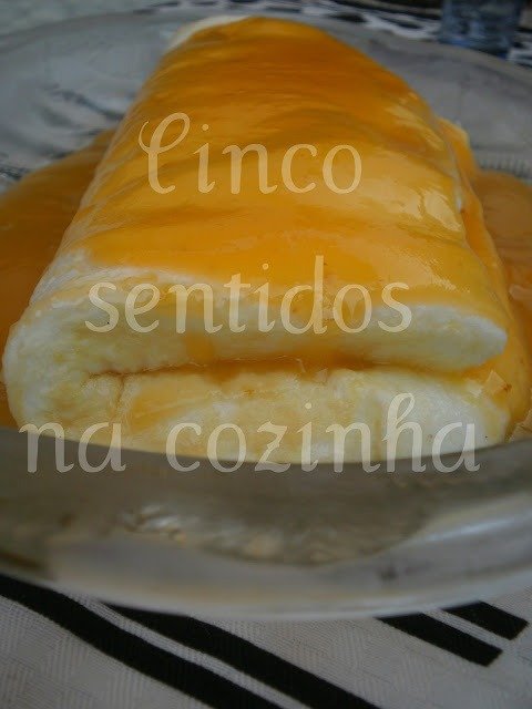 - Bata as claras de ovo em castelo com um batedor manual, muito bem batidas. Junte 160 g. de açúcar e mexa tudo muito bem, com uma colher de pau sem bater. Coloque a massa num tabuleiro anti-esturro tamanho grande, untado com margarina, ou num tabuleiro normal mas forrado com papel vegetal untado. Leve ao forno brando durante 30 minutos, até a massa ficar loura (não abra a porta do forno durante a cozedura). Quando cozida, retire cuidadosamente a massa do tabuleiro, passando-a para um pano seco polvilhado com açúcar e barre-a com o doce de ovos.