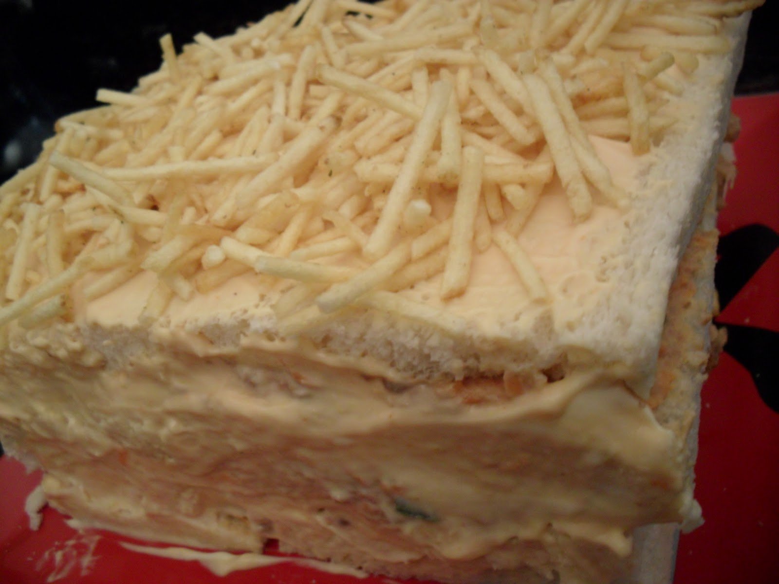 - Misture o atum com meio vidro de maionese e meia lata de creme de leite, sem soro. A outra metade da maionese e do creme de leite misturar com a alface picada. Umedecer levemente, as fatias de pão, com caldo Knorr e espalhar sobre elas o creme de atum e o creme de alface, alternando as camadas. Cobrir a torta com maionese.