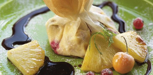 - Sirva o abacaxi com as trouxas polvilhadas com açúcar em pó. Decore com as physalis, a hortelã da ribeira, caramelo líquido e o molho resultante do abacaxi.