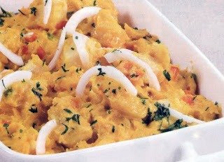 - Numa panela grande, coloque o azeite de dendê e aqueça em fogo alto. Acrescente a mistura de bacalhau e os camarões secos e cozinhe, mexendo de vez em quando, por 15 a 20 minutos. Junte o pão e o leite de coco e continue a cozinhar, mexendo sempre, até surgirem bolhas na superfície da mistura. Acrescente o gengibre e as castanhas de caju e cozinhe por mais alguns minutos. Verifique o tempero e junte sal e pimenta a gosto. Tire do fogo, coloque numa tigela de barro e sirva.